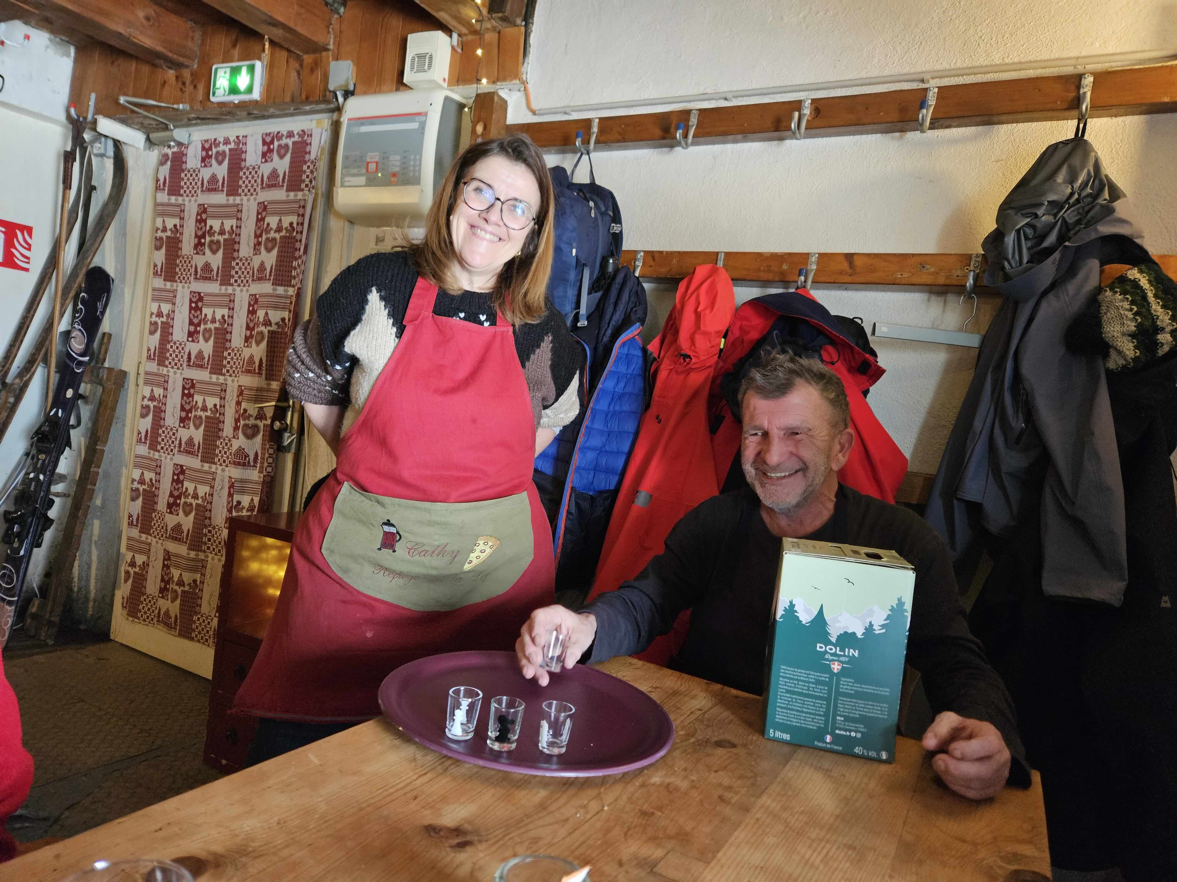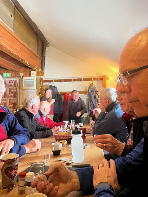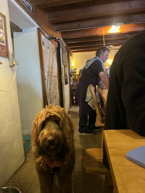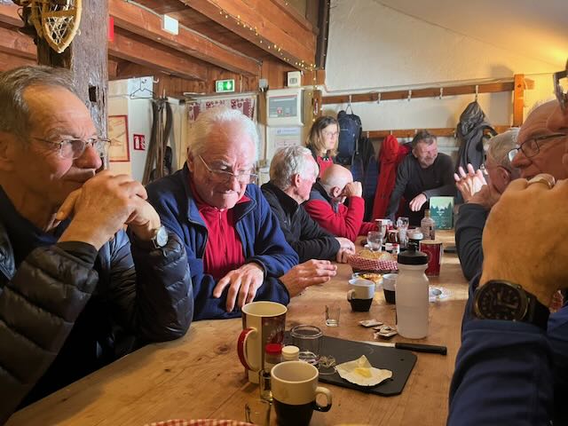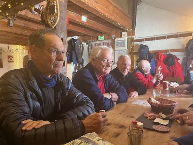 Tarte au myrtilles was a welcome follow up with coffee followed by Franck getting out his box of industrial strength genepi. At one point it looked like Franck was fixing to have us stay the whole afternoon. He was an extremely warm and generous host and even given his announcement that the genepi and the coffees were on the house, it was hard to believe the per head cost of only just over 30 euros. Conversations were as usual wide rangeing. Peter T mentioned his anti-choking device, although there was some puzzlement as to why he didn’t have it with him. It appears to look like some kind of sink un-blocker. Given the various suggestions as to what other bodily malfunctions/orifices the device could be applied to, it was perhaps a blessing that by this time we had La Loge entirely to ourselves.