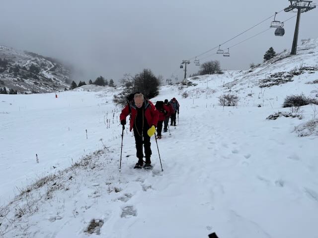 A very prompt meet up at Divonne parking took place under frankly unpromising skies, with the sky unable to make up its mind whether to snow or rain. Weather improved on the way to our respective jumping off points, although we still had 10/10ths cloud. Eschewing the preferred Taylor option of walking up from the very bottom, we took the bubbles up the mountain. Snow shoes on, we set off for Franck’s under gradually clearing weather with Peter Strebel predicting 11 out of the 2 periods of clear patches. Not a particulary long or difficult route but with very variable snow conditions underfoot.