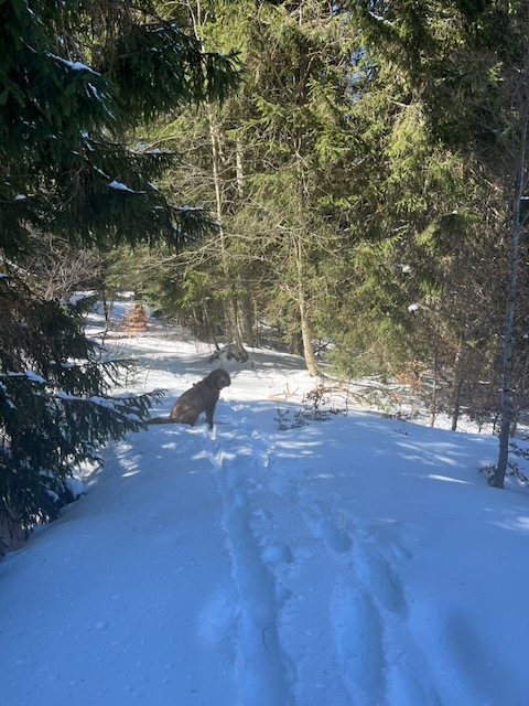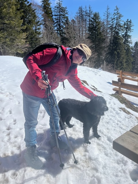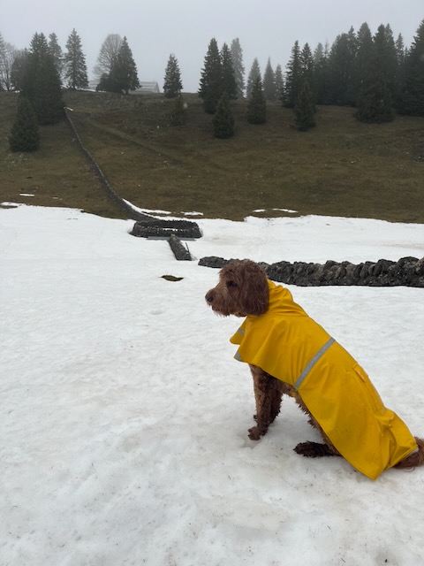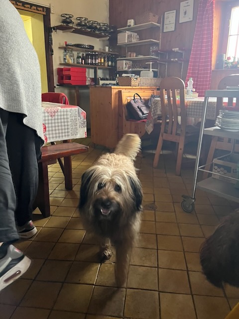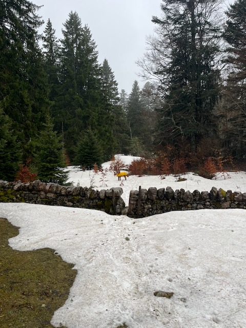 Maria had indicated that the Buvette closes on 13 April 2026 for the season. As I felt that I had left 10 days ago without saying a proper goodbye, I decided to re-hike the last route to La Genolière and give them a bottle of bubbly. It was a wet Sunday and Kobie and I waited until midday when the worst of the rain had past and it was merely moist. From Tancouez to the Buvette we encountered only one other party, the hills were damp and quiet. There was still plenty of snow in the forest and on shaded slopes – it’s going to take weeks for that to melt.