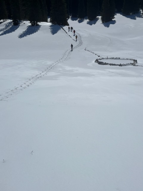 Broaching the top at 1400m we turned slightly left to follow the path down along the ridge to the gap in the wall to the secret forest. Only here the snow depth completely covered the wall.