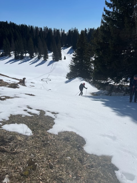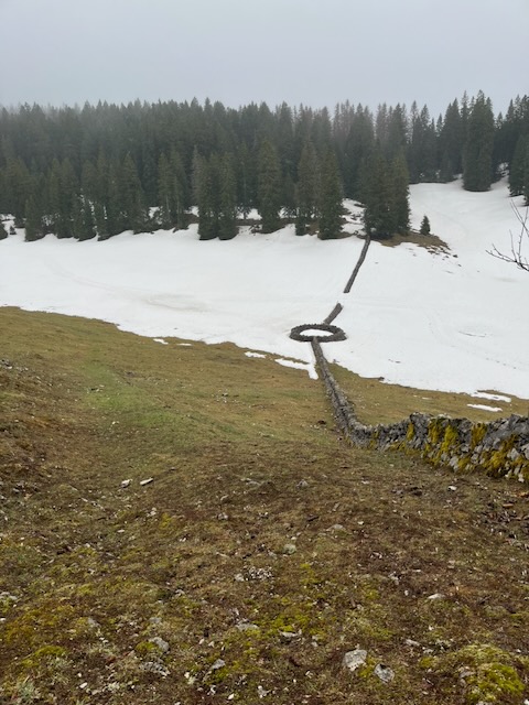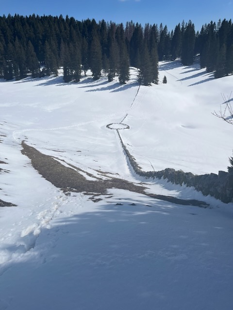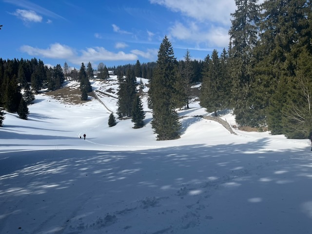 The day was bright and clear but with a cold bise wind still somewhat evident. My plan was to track past Les Mouilles through the wood to fields then W and NW then SW to the Fruitières de Nyon Chalet, thence up to Cabane Rochefort 1388m for apèros. After that we would travel WSW through the wonderful “secret” forest before a drop down into Grande Combe then steeply up to La Genloière itself at 1348m.