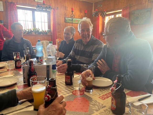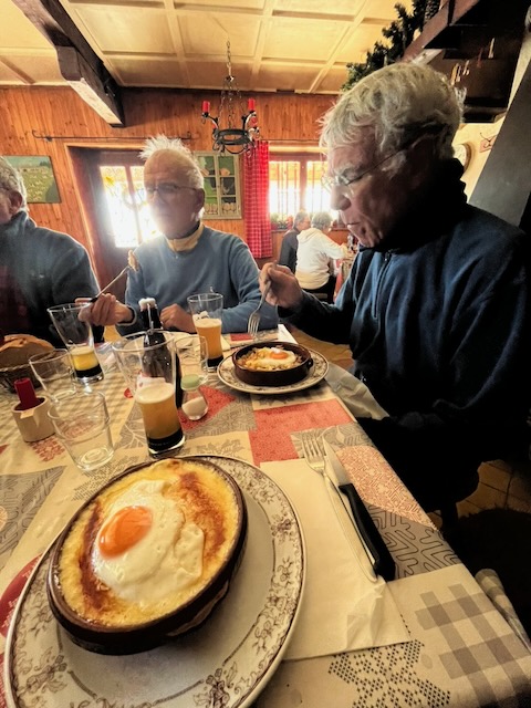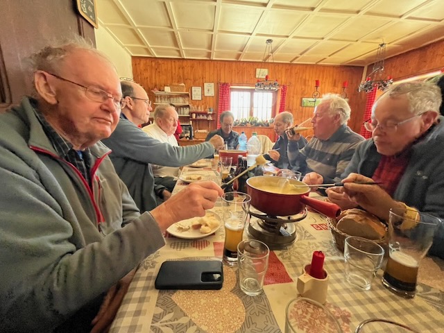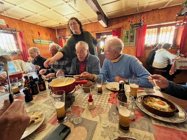 This was to be a last visit and fondu of the winter season to say farewell to Maria and her fellow crew at the Buvette de La Genolière before they close for the summer season when the place becomes a cow byre. Initially ten signed up, but we had one cancellation and one addition – that of Robert O’Riordan who was to join us for the lunch only.