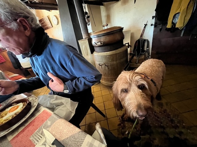 We knocked and entered at 1.40 pm with Moos and Zwikon there but no guests at all and signs that the team were packing up. There was some tart evident and Maria came down hearing Kobie’s bark. I gave her the bottle and was provided with a coffee and tart on the house. Then Maria fetched from a shelf a pair of gloves – my nice pair with wrist loops that I had left there 10 days ago and had still not noticed that they were missing! We thanked each other. Maria said that she and her team (family or friends?) move to a Mt Tendre chalet for the summer to look after the cows up there, sadly there is no buvette at that chalet. The Genolière Buvette will reopen on 6 Novembre. Put that in your agendas: