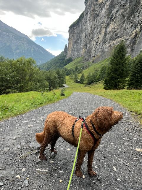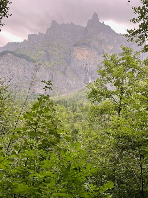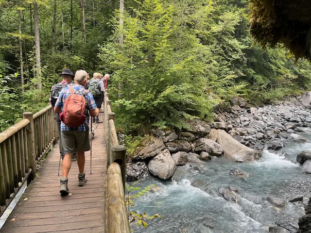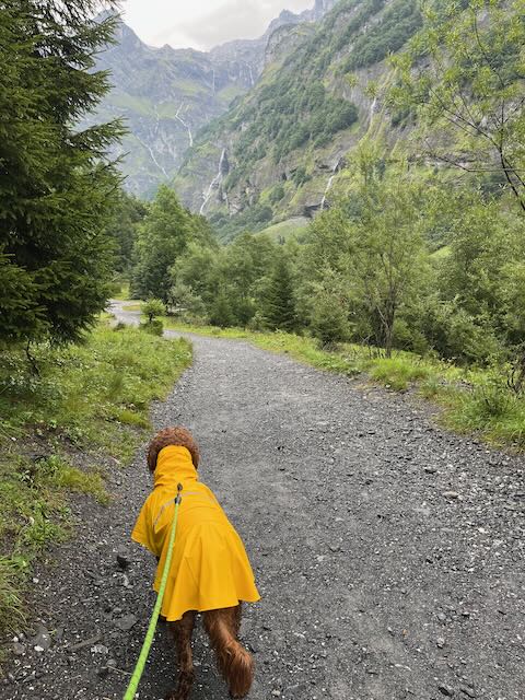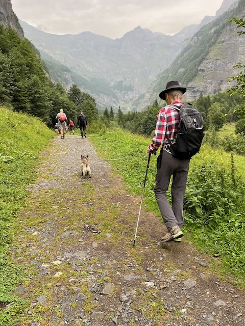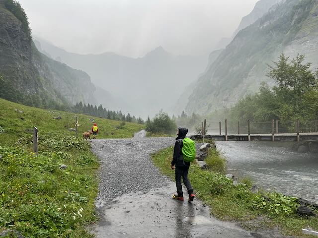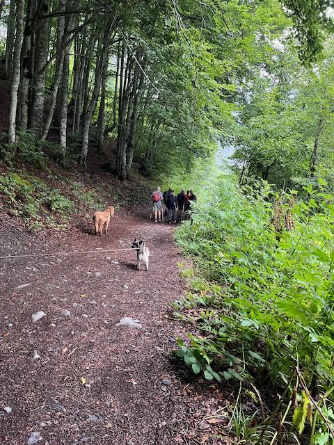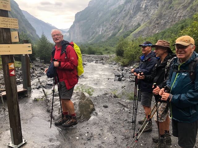 Mike Muller and Nessie with me and Kobie had to turn around at Prazon after the coffee stop. Dogs cannot enter the Reserve Naturelle which starts 2.5km up the main valley (and encompassed the area on the outside of the valley bottom from Sixt). I had checked out the trails on Outdoor Active, which had not identified the Reserve, but I had an inkling that this was the case. Mervyn’s “dogs allowed” was not going to work. No worries, as we had had a good start to the coffee stop in the woods to Prazon and by which time water was falling from the sky.