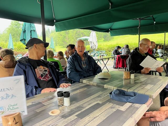 Donning rain gear we rode on to the foot of the shaded Bonmont climb. I for one shed a layer to avoid a personal sweaty sauna during the ascent By 11:30 we reached the summit with Peter claiming the polka dot jersey. We did check that this time he wasn’t on his e-bike, but being a doctor perhaps he has access to performance enhancing substances? Nevertheless, chapeau Peter!