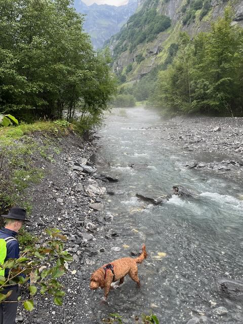 Dog wallowing – clear river that turned grey after the rain