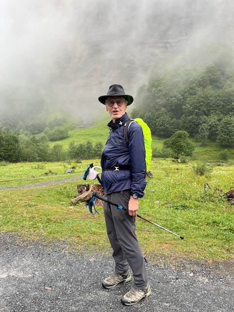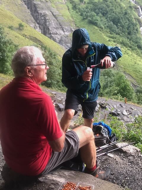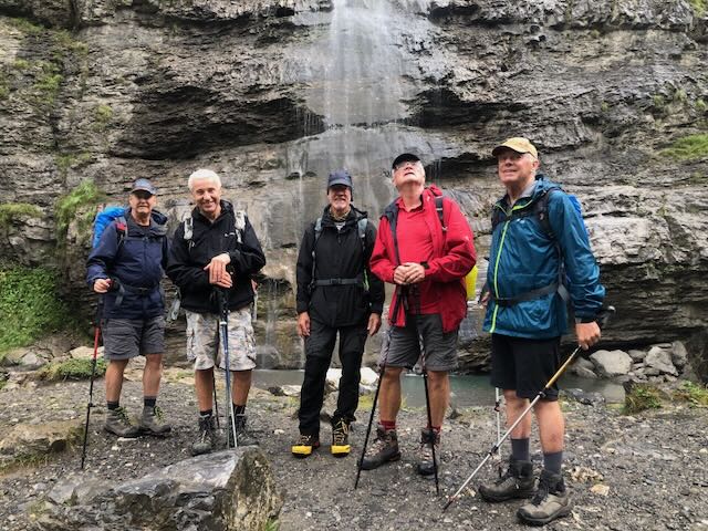 Not as dramatic as during the spring melt but impressive nonetheless. Under continuing rain we climbed higher on a path, in parts liberally strewn with sheep shit, until reaching a large dryish cave in the cliff face under a waterfall where we took shelter and enjoyed our picnic lunch. Peter had generously offloaded pretzels and a bottle of Côtes du Rhône, which was consumed appreciatively. A surprising number of hikers/walkers including kids had made it this far on a wet Wednesday, some shod in distinctly sub-optimal footwear.