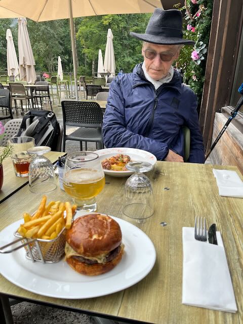 We entered the Chalet with Kobie barking in excitement, and thus we were offered a suitable table outside, happily under large chalet eaves and which suited us perfectly. A fine glass of IPA for me, an iced tea for Mike and a superb lunch of burger, chips and local sausage ensued, with desert of chocolate mousse and cheesecake. And good and friendly service.