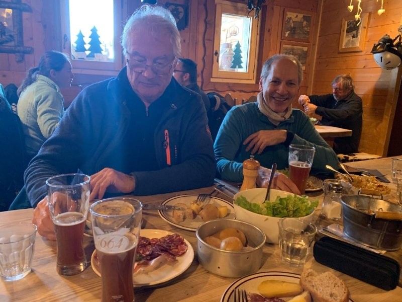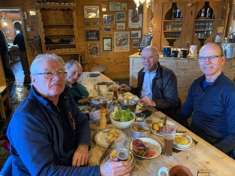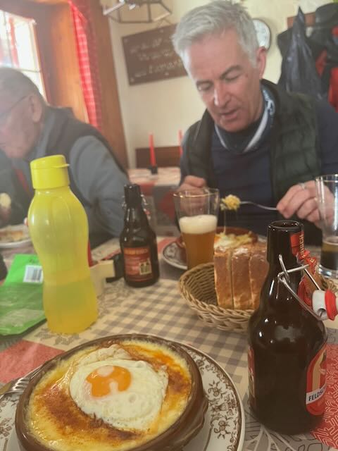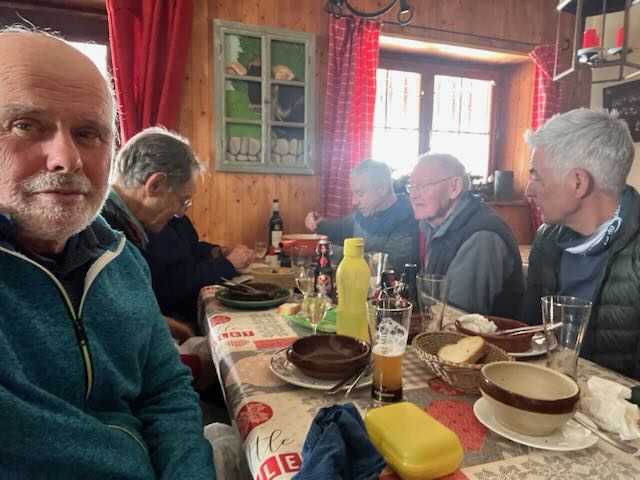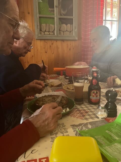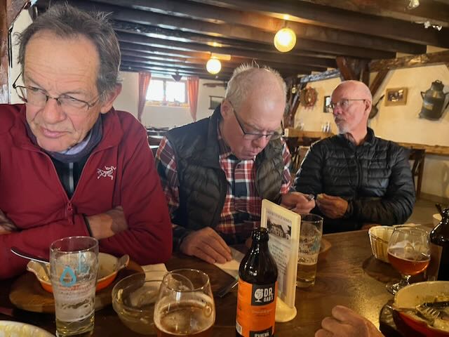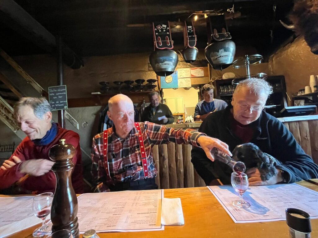 Although we had plenty of time, I decided to stick with the horizontal approach to Gilly and we were soon through Genolier, Vich, Luins, Vinzel and Bursins arriving just after midday to a table in the sun, with beers coming quickly. The menu was Chf 25 for those on AVS, very good value, soup or salad, main course, dessert and a deci of chasselas. Sadly PeterSo was too young to qualify and he put on a brave face especially after Paul gave him his wine.