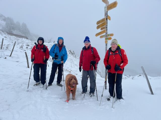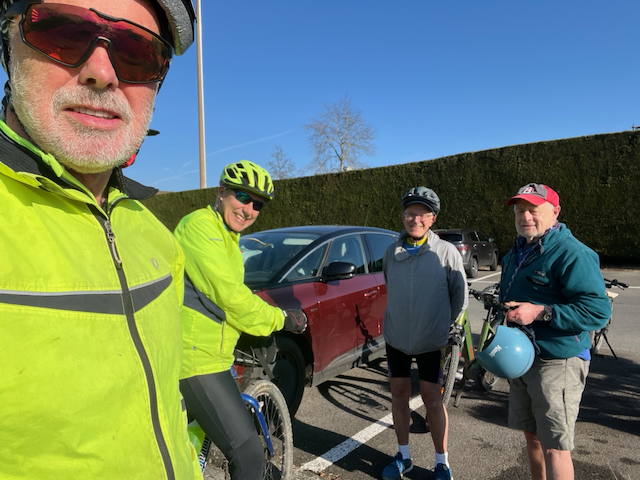 The forecast was for sun and 15C at least. More in hope than anything I invited the team to partake of the first GIN bike ride of 2026. This was my first outing in over 4 months but Paul S had been out many times. He and Philip even turned out in shorts! (both on their E-bikes). Rounding it out to make a fab 4 was PeterSo (like me non-E), and we all appeared at Everness at 10 am in bright sun, not a cloud, it had been like this for 3 days after a February of rain and gloom with heavy snow high up.
