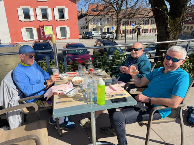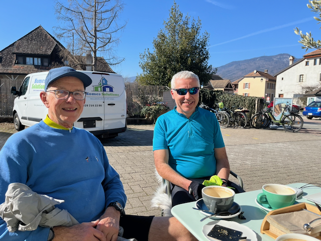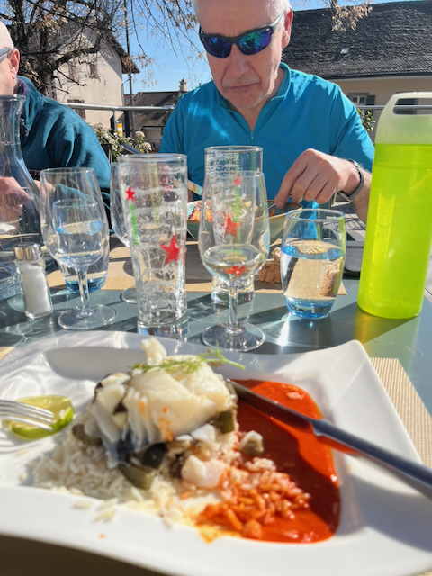 Indeed the weather was stunning and those in shorts almost had an advantage. My plan was to head for Gilly lunch by 1pm, with a coffee stop perhaps on the way. As this was the first ride of the season we could sensibly skip Bonmont and other climbs and head across in comfort. We tracked across to God’s crossing then up to Crassier turning up right afterwards alongside the ruisseau, Le Boiron de Nyon. A left turn and up past Tranchepied to a water break just below the forest. From the Cheserex golf course we passed above Gingins and arrived at our favourite coffee stop at Givrins where Paul treated us to tarts and caffeine in the sun.