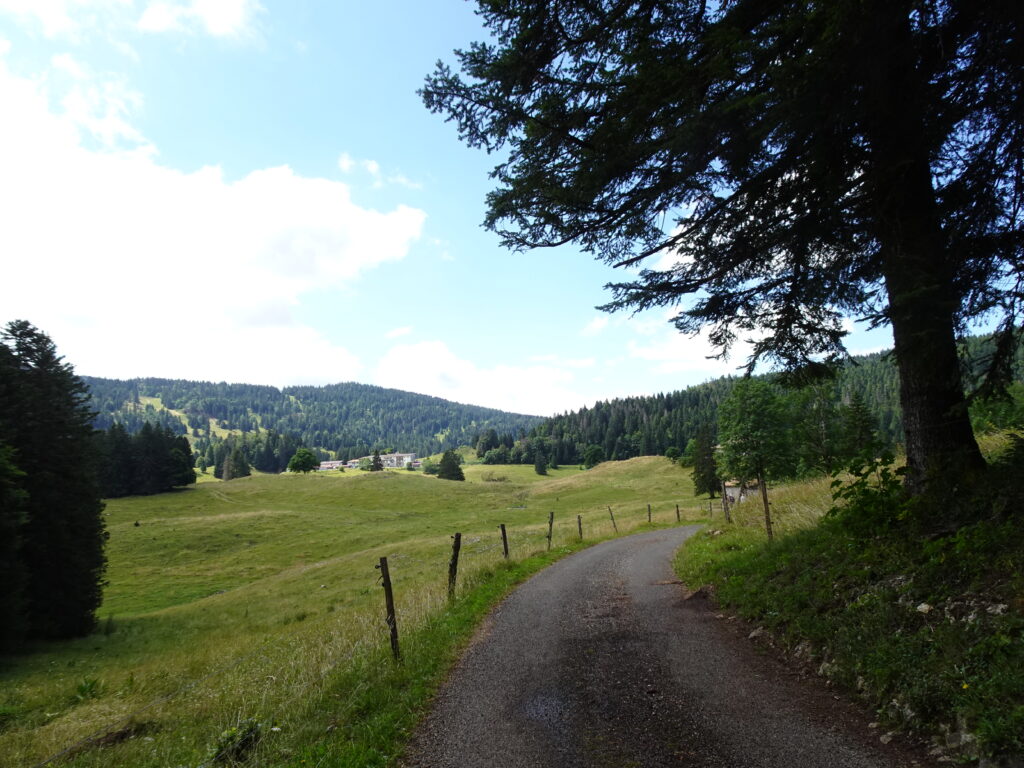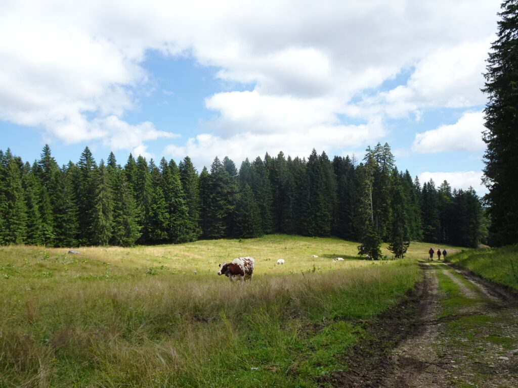 There are several trails to the Catheline, none signposted. Apparently signage isn’t allowed in summer but is in winter, for reasons I don’t understand. One of the trails is a pleasant hike up to the Crêt de la Neige, another is extremely steep, another follows the ski track and another, the one we took, is mostly on jeep tracks to the Catheline with a steady slope upwards for about two kilometres following the contours of the mountains up to the table d’orientation at the Col de Crozet (1485m).
