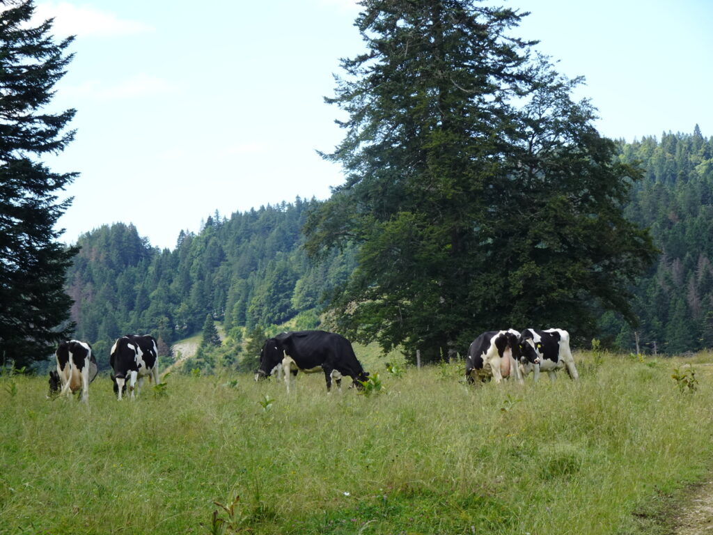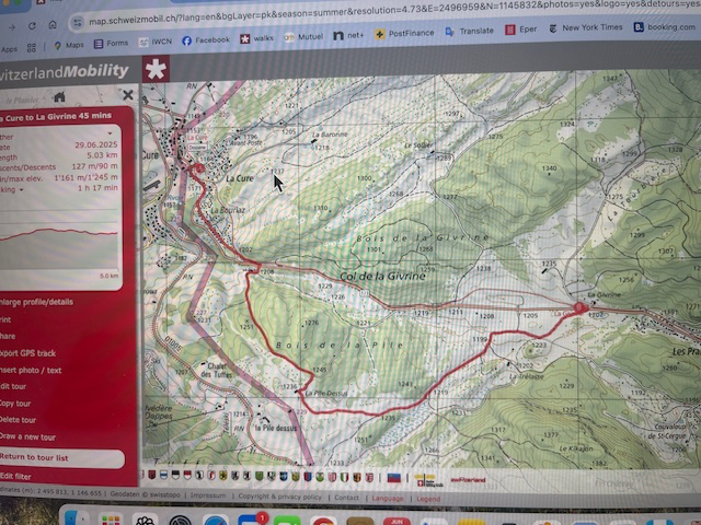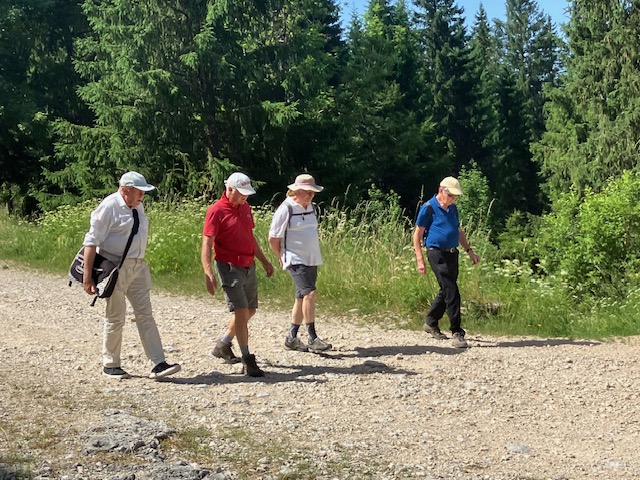 My hips not being great for steep climbs, I proposed a short walk up in the hills to avoid the heat in the plain. It started at La Cure so Paul Sochaczewski, Tim Goodyear and Richard Flett boarded the train from Nyon and picked me up (Mike Muller) at Trelex. We were joined by Robert O’Riordan at St Cergue. At La Cure we were met by Mark Warren who had come by car. Peter Drew cancelled at the last minute due to a bug biting his foot.