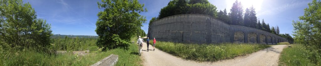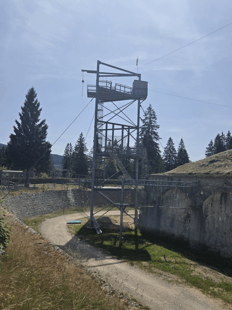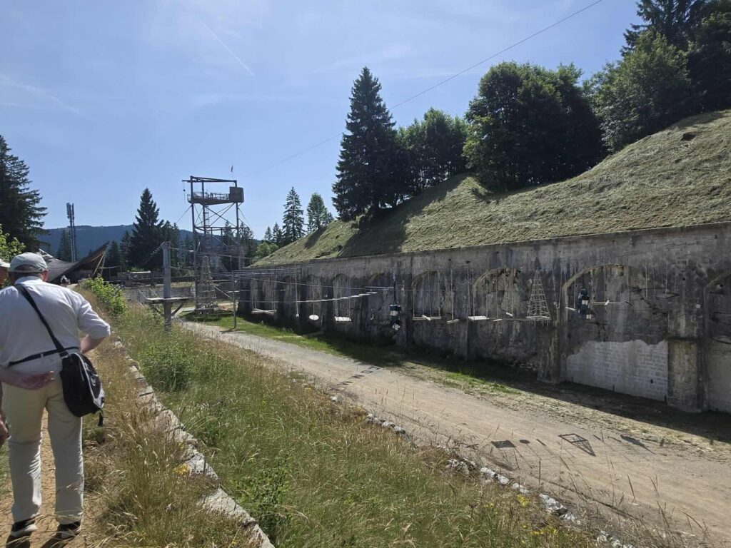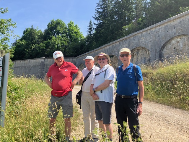 The walk of about 3 km was around its walls on a rough road/good trail that revealed views over the Dôle side of the Jura. There were occasional plaques explaining the history of the fort; towards the end the road was closed for restoration work on the ramparts which entailed a deviation through a very welcome shaded path in the woods. We then came upon a commando course which was unfortunately closed so we couldn’t climb up various ropes or use any of its three zip wires!